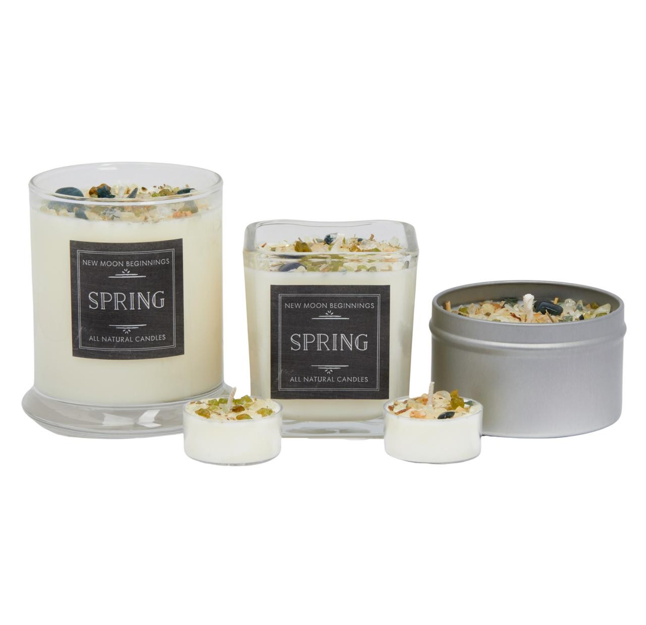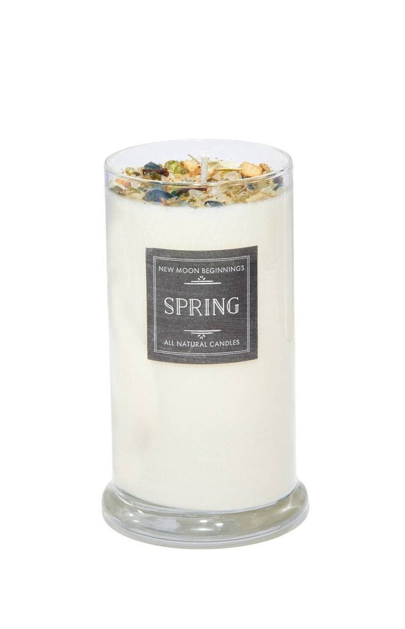 Our Spring Candle is a fresh and energetic scent which we created to promote Balance, New Beginnings, Action, and Abundance. Spring is a time to invite equilibrium and renewal into the mind, body, and spirit. It is a time when day and night are equal in length, and it is marks the shift from darkness and cold to warmth and light. It is a time of year to cultivate new ideas. It ushers in a renewed sense of energy brought in to help you focus and move forward in new, fresh, and positive ways. The Spring Candle has a Citrusy and Herbal scent with a wide variety of Healing Crystals on top, including Citrine, Peridot, Moss Agate, Lemon Quartz, and Clear Quartz.